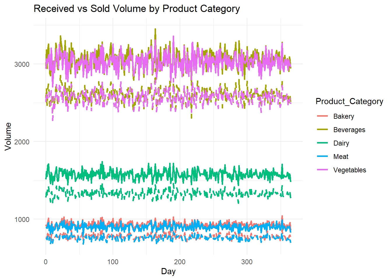 labs(title = "Received vs Sold Volume by Product Category", x = "Day", y = "Volume") +