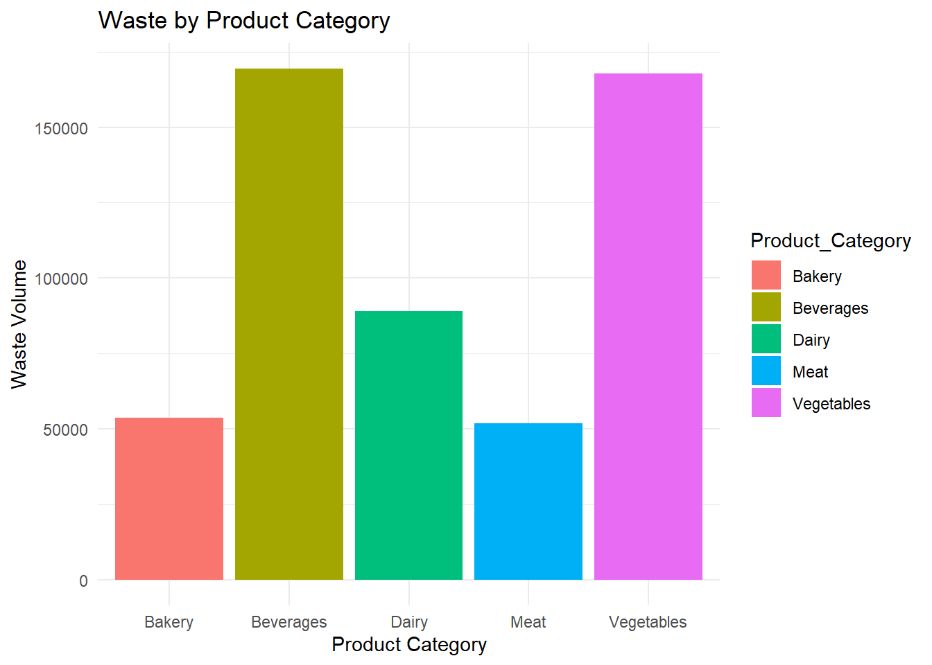 labs(title = "Waste by Product Category", x = "Product Category", y = "Waste Volume") +